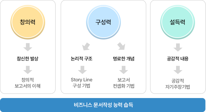 - • 문서작성기법의 습득으로 논리적이고 이해가 비즈니스 문서 작성능력 획득한다.