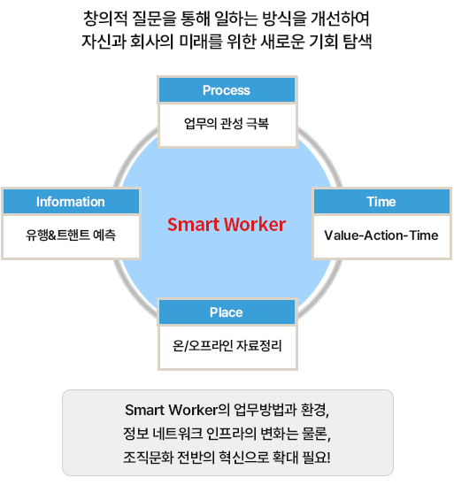 • 프로세스를 개선하라 : 질문을 바꾸면, 방법이 바뀐다, 업무 프로세스화, 개선점 도출 • 시간을 단축하라 : 인생 Value-Action-Time, 프로젝트로 변환, 시간단축 스킬업 • 정보를 장악하라 : 유행 & 트랜드, 변화에 대한 예측 & 대응, 위기에서 찾는 기회 • 공간을 정리하라 : 디지털 자료 정리, 오프라인 자료 정리 • 성공적인 스마트워커를 모방하라 : Case Study • 스마트워커로 성장하기 위한 필수역량의 강화 : 리더십은 직책이 아닌 영향력이다, 영향력 강화 3단계 전략 • 프레임워크의 개선과 변화의 시발점 만들기 : 삶의 피드백 |