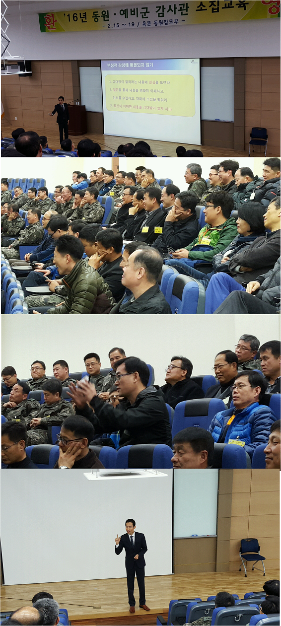 육군본부 및 수임군부대 감사관 「 이미지 변화와 소통 」특강 대한민국 육군, 해군, 공군 중령님들 및 군무원 감사관님들의 열정적인 참여에 감사 드리며, 우리나라 국방의 최후 보루로서의 동원 예비군 전력 강화역량 제고를 위한 의미있는 교육이 되셨으리라 믿습니다. 육군학생군사학교 교육 주관부처의 과장님과 감사장교 강성근 중령님의 노고에 감사드리며, 국가와 군을 위해 불철주야 각 근무지에서 헌신하시는 감사관님들의 건승을 기원하겠습니다. 삼성리더십센터 대표이사 대한민국 육군 예비역 중위 김원규