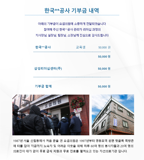 한국A공사 관리자 리더십 교육과정 기부금 내역 페이지 정보 조회 5,543회 작성일 06-05 22:02 목록 본문 . 이전글S그룹 신입사원 역량개발 과정 기부금 내역 06.05 다음글한국M공단 사내강사 양성교육 기부금 내역 05.30