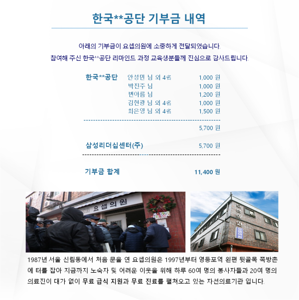 한국V공단 리마인드 교육 기부금 내역 페이지 정보 조회 5,952회 작성일 07-02 00:58 목록 본문 . 이전글고려대학교의료원 교직원 교육 8次 기부금 내역 07.05 다음글고려대학교의료원 교직원 교육 7次 기부금 내역 07.02
