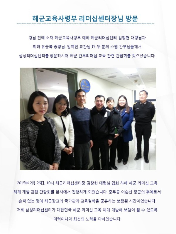 해군교육사령부 리더십센터장님 방문 페이지 정보 조회 8,582회 작성일 02-27 21:31 목록 본문 . 이전글한국도로공사 2015년 신입사원 입문교육 04.13 다음글베트남 하노이 '트엉끄우 중학교' 지원 및 기부 내역 02.26