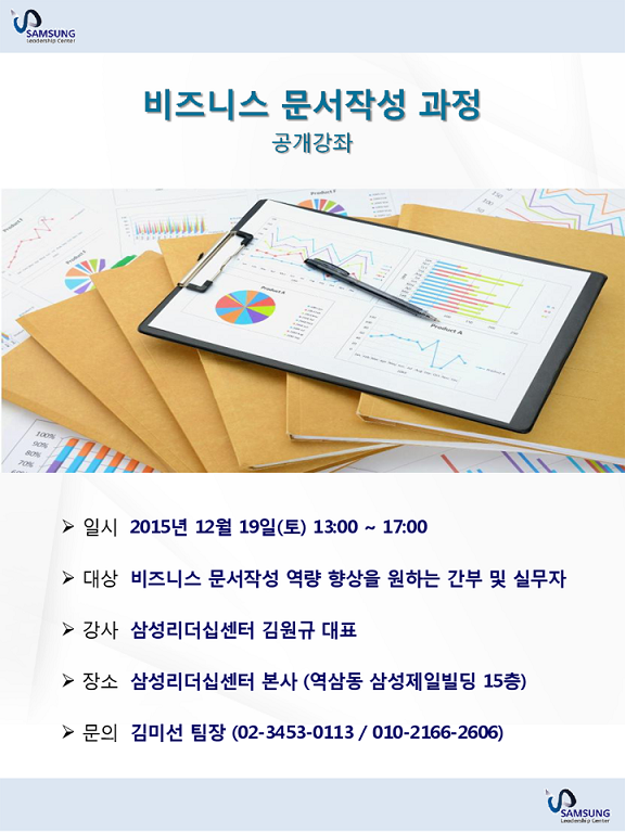 비즈니스 문서작성 역량 향상을 원하는 간부 및 실무자분들의 많은 관심과 참여를 부탁드립니다. ----------------------------------------------------------------------------------------------------------------------- 나눔강의는 삼성리더십센터가 실천하고 있는 기업이익의 사회환원 사업입니다. 삼성리더십센터는 비영리 단체나 영세 중소기업을 대상으로 나눔강의를 확대해 나아갈 것 입니다.