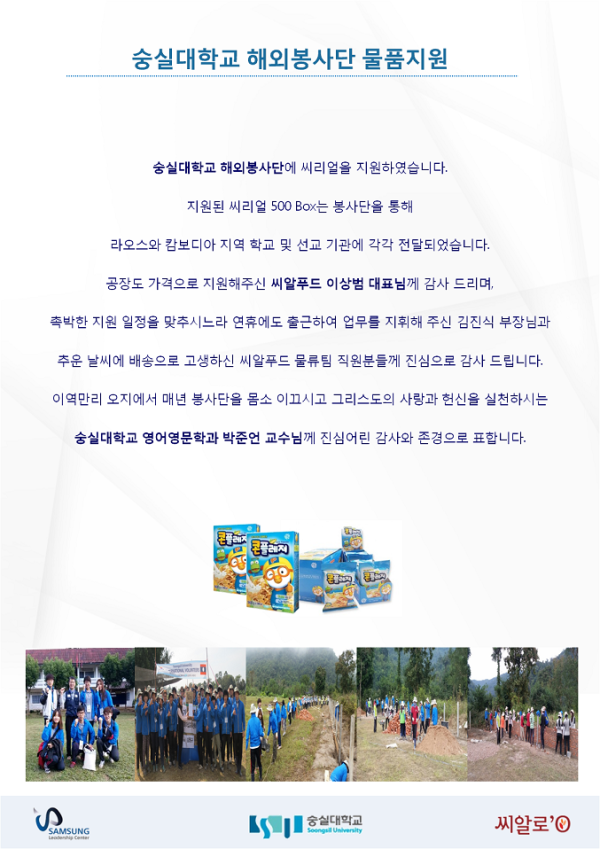 숭실대학교 해외봉사단 물품지원 페이지 정보 조회 7,449회 작성일 02-01 19:53 목록 본문 . 이전글[나눔강의] 소령, 중령, 군무원, 감사관 대상의 '이미지 변화와 소통' 특강 / 김원규 대표 / 육군학생군사학교 03.30 다음글[나눔강의] 비즈니스 문서작성 과정 / 김원규 대표 / 삼성리더십센터 본사 12.07