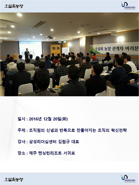 최초 아모레퍼시픽그룹 승진자교육에서 인연이 되어 오설록농장 임직원 혁신 워크샵에 초청해 주신 우성배 과장님과 오설록농장 이진호 대표이사님, 그리고 특강을 경청해주시고 따뜻한 마음으로 격려와 응원을 아끼지 않으신 모든 임직원분들께 진심으로 감사를 드립니다. 오설록농장의 무궁한 발전과 건승을 기원하겠습니다! ^^