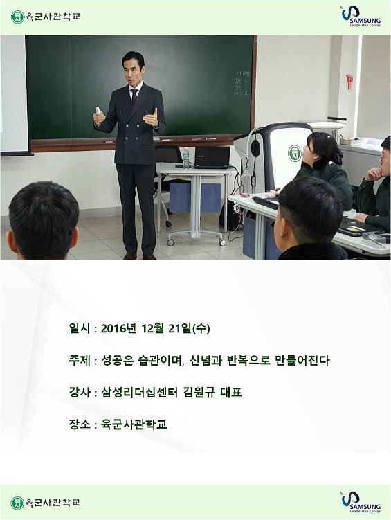 김원규 대표님과의 오랜 인연을 갖고 계시는 육군사관학교 경영학과 이민수 지도교수님의 초청으로 경영학과 생도 리더십 특강을 진행하였습니다. 육군사관학교의 무궁한 발전과 이민수 교수님의 건승과 경영학과 생도들의 미래를 응원하겠습니다.
