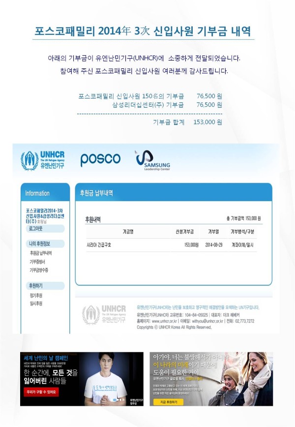 포스코패밀리 2014-3차 신입사원 여러분! 여러분께서 보여주신 교육에 대한 열정이 더 없이 훌륭한 교육성과를 만들어 내는 것을 여러분과 저희 임직원 모두 확인할 수 있는 멋진 교육과정이 아니었나 생각합니다. 진심으로 감사합니다. 여러분이 참여해 주신 유엔난민기구 후원내역을 공지합니다. 앞으로도 회사와 가족을 넘어 전세계에 영향력을 확대하는, 포스코의 위상에 걸맞는 인재로 성장하시기를 바랍니다.