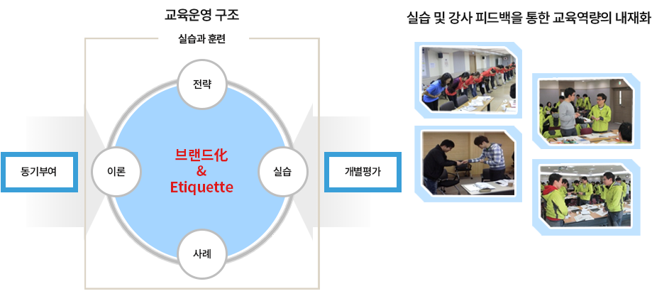 • 업무현장에서 인사의 의미와 상황별 인사예절 • 비즈니스 소개 예절 및 상호 호칭에 대한 예절 • 악수, 명함, 상석의 이해 및 전화예절 실습 • 성공적인 직장인의 사무실 내외의 근무 에티켓 • 직장인으로서 올바른 용모와 복장이 성공을 좌우한다. • 유능한 신입사원의 성공 비즈니스 서비스 화법 |