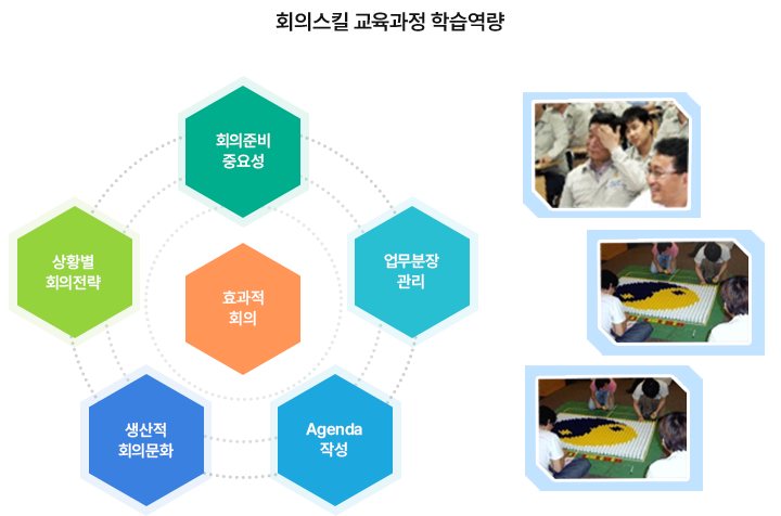 • 회의안건 선정 및 단계별 실행 실습 - 준비, 실행, 종료의 실행과 피드백 • 회의가 성과혁신으로 연결되지 못하는 이유 - 세부 실행계획의 실행과 역할안배 - 의사결정과 의사관철을 연계하는 핵심 스킬 |